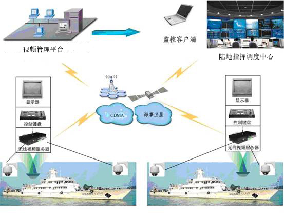 陆地调度指挥中心设置中心管理平台及显示大屏幕系统,实现把无线视频监控放在一个监控平台进行管理、控制。整体网络拓扑如图所示。