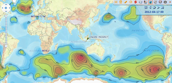系统也提供全球权威海上气象预报信息,内容包括气压、冷暖锋、500百帕、风、浪、涌、洋流、气压、海水温度、能见度和冰请等和海上相关的预报信息,并将这些信息和船舶位置信息进行叠加,直观明了,易于海上日常生产和安全管理。