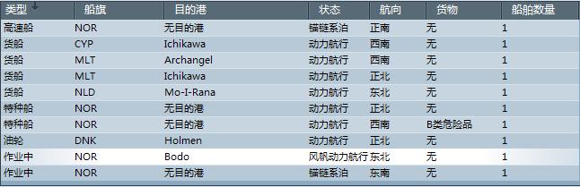 系统具有船舶数量统计与分析功能。如下图所示,电子地图上清晰可见每个区域中的船舶数量, 按照船舶类型、船旗、目的港、航行状态、航向和货物类型分组统计。